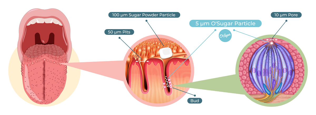 O’Taste’s micromilled sugar and salt crystals — with a precise D50 of ~5 μm — are engineered to match this natural pore size. This allows each particle to enter the pore directly, dissolve exactly where taste is triggered, and activate a faster, stronger flavor signal.