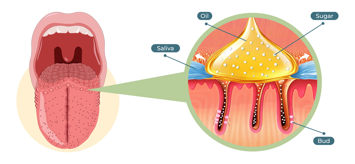 The combination of micro‑scale particles and lipid dispersion produces faster, stronger sensory release. Oil removes saliva from the tongue and allows optimal contact of the flavorant solid particle with the taste pores where it is rapidly dissolved in saliva in the pore to activate the nerves that carry the taste signals to the brain